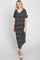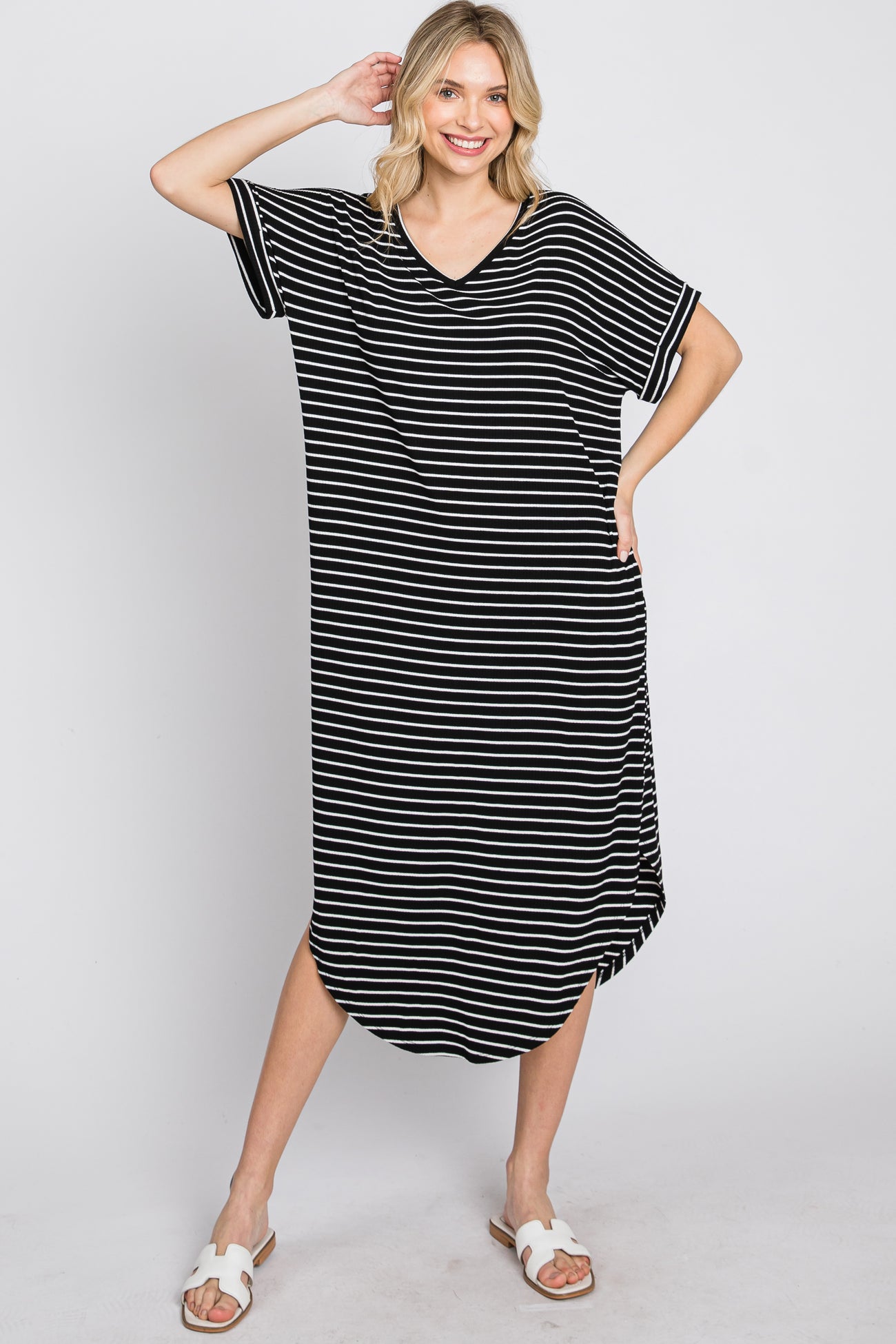 A striped ribbed midi dress featuring short cuffed sleeves, a curved hem and a rounded v-neckline.