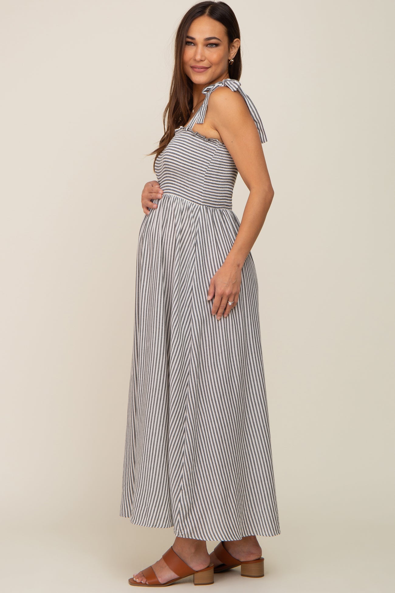 Black Striped Smocked Shoulder Tie Maternity Maxi Dress