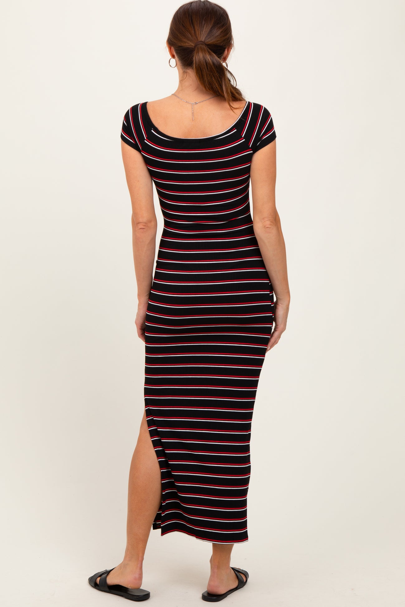 Black Striped Wide Neckline Side Slit Maxi Dress