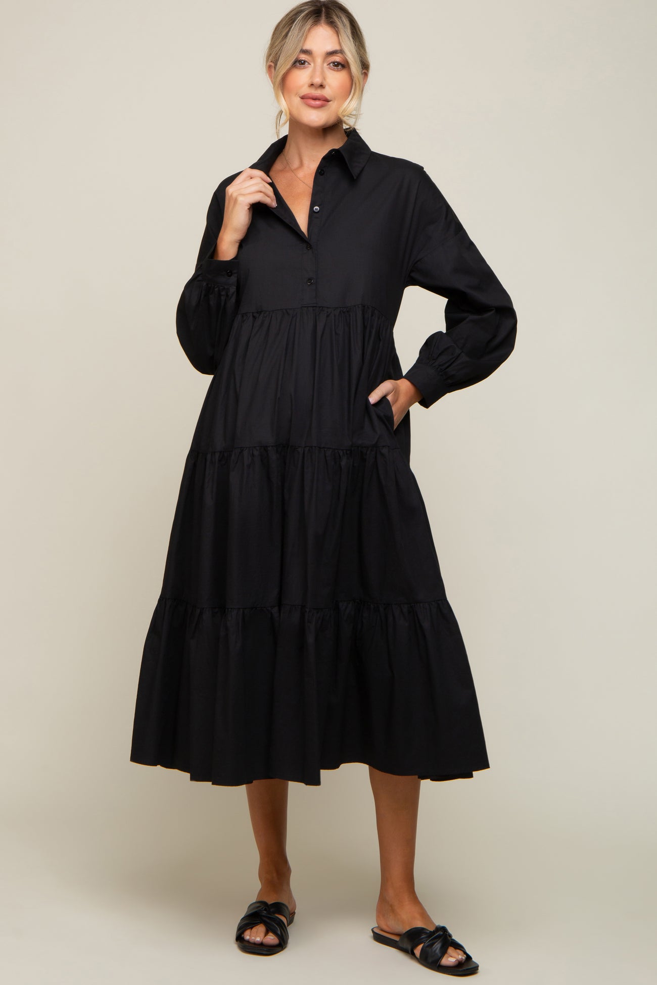 A solid long sleeve button down maternity maxi dress in a tiered style. Pocketed.