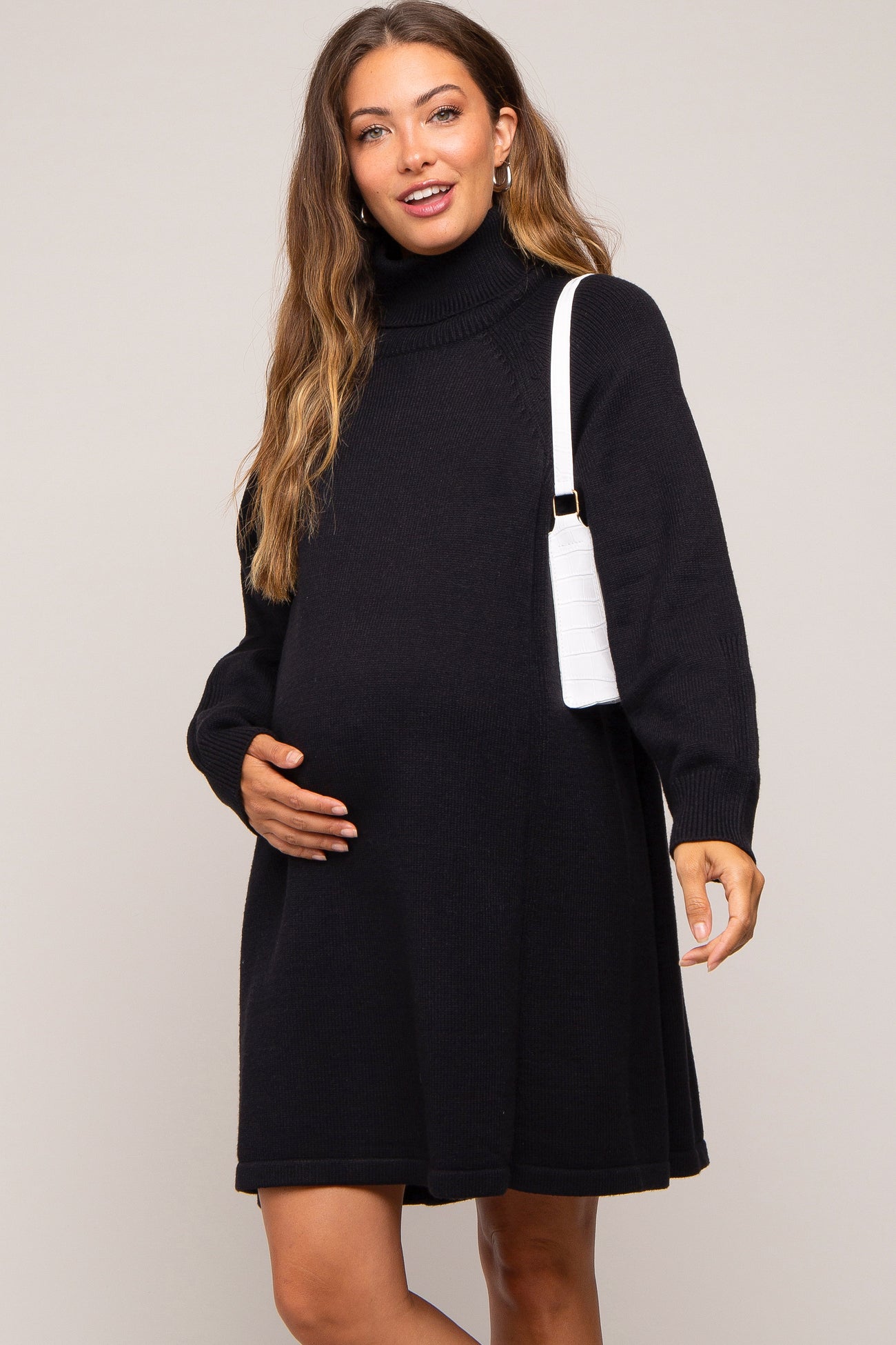Elevate your maternity style with our Black Turtleneck Long Sleeve Maternity Sweater Dress. Crafted from a soft, stretchy knit, this dress gently hugs your growing bump, providing comfort and a flattering silhouette throughout pregnancy and beyond. The classic turtleneck and long sleeves keep you cozy, while the rich black color offers endless styling possibilities—from casual daywear with sneakers to chic evenings with boots. Designed to grow with you, this sweater dress is a versatile closet staple for expecting moms who love effortless elegance and unbeatable comfort.