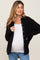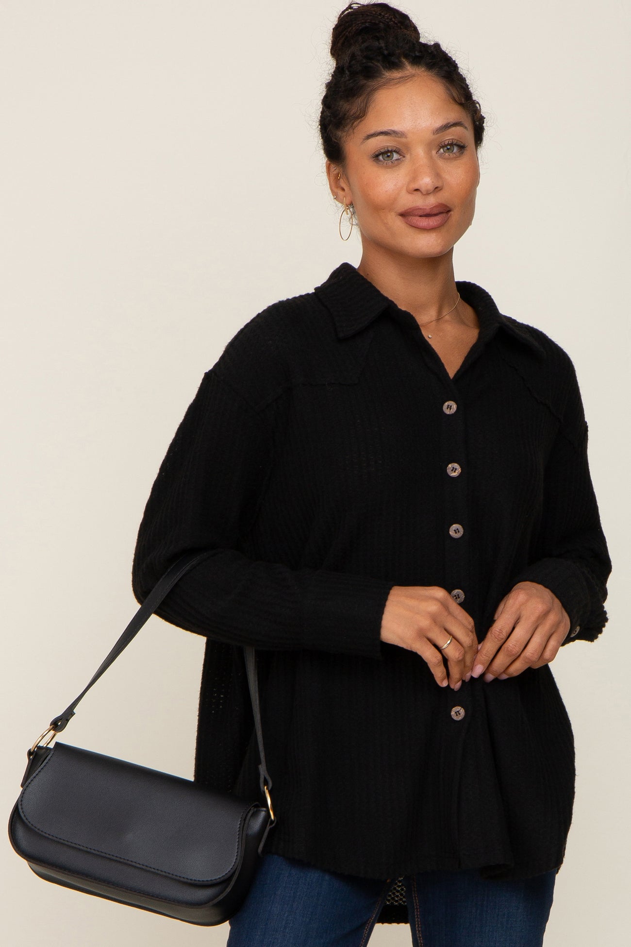 A soft, waffle knit maternity top with front buttons, a collar, long cuffed sleeves, and a rounded bottom hem.