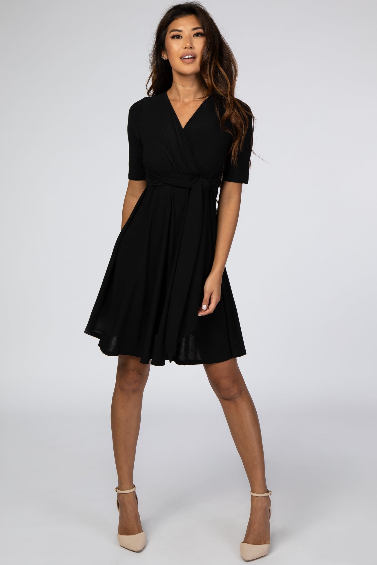 A solid nursing dress featuring a self-tie waist, short sleeves and a wrap v-neckline.