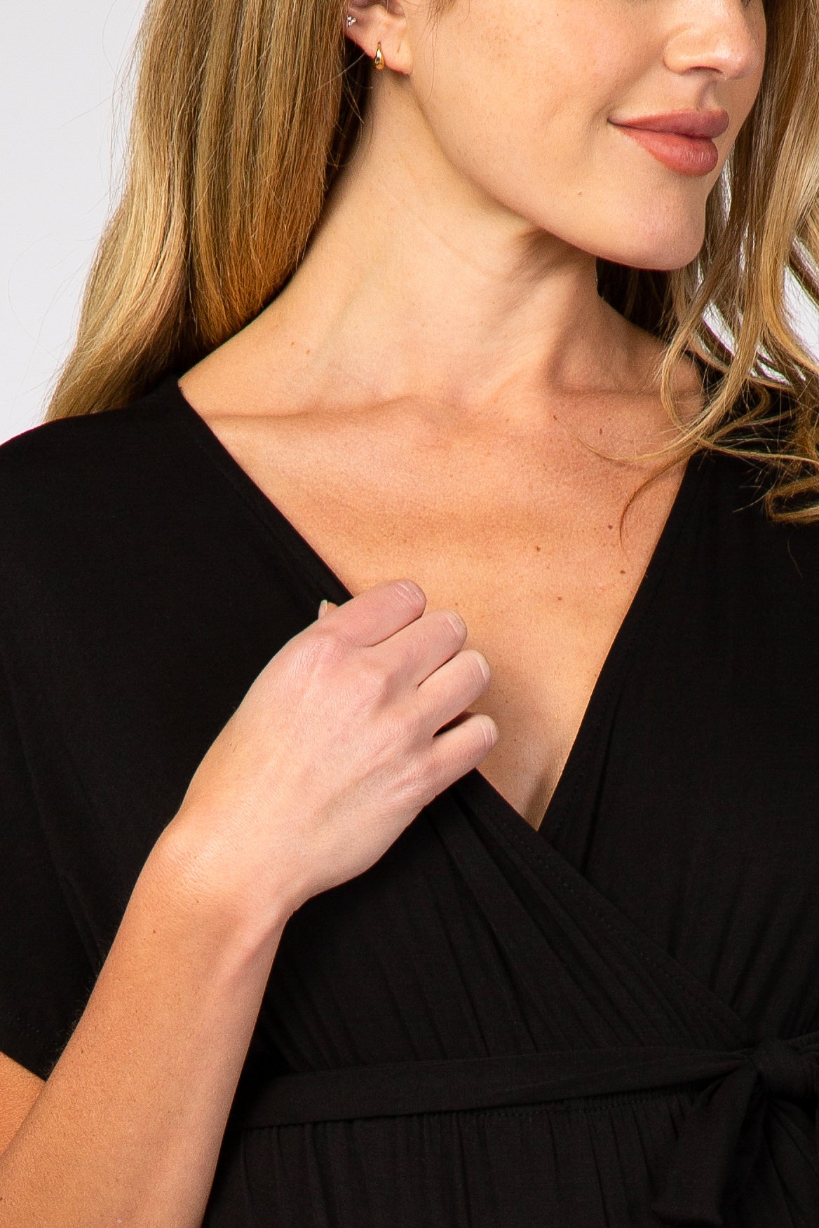 A solid hued maternity jumpsuit featuring short dolman sleeves, a v-neckline with wrap accent, a cuffed, tapered leg style, and a sash tie.