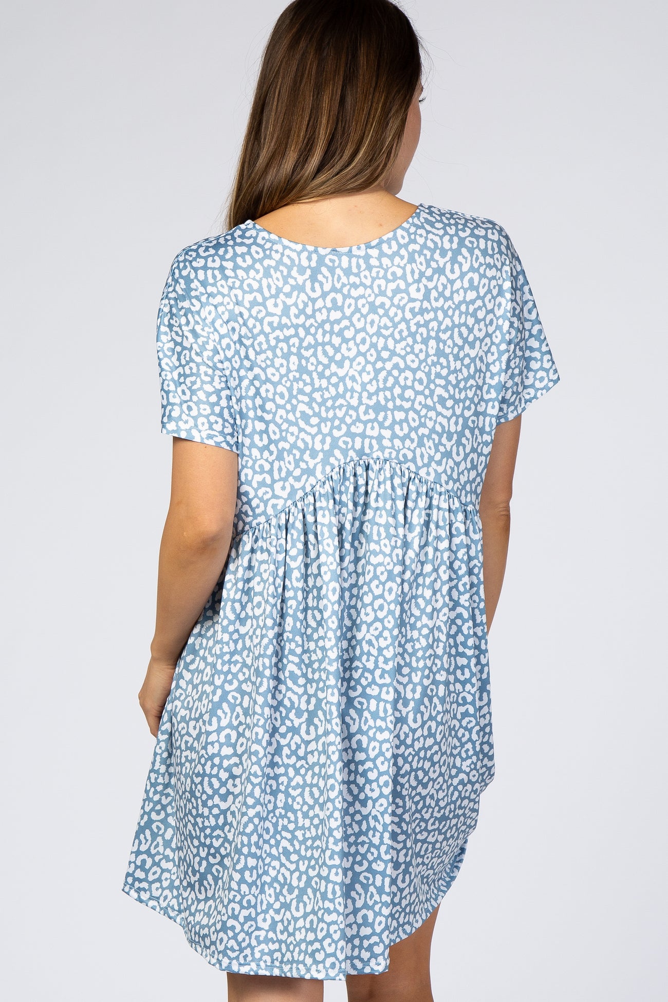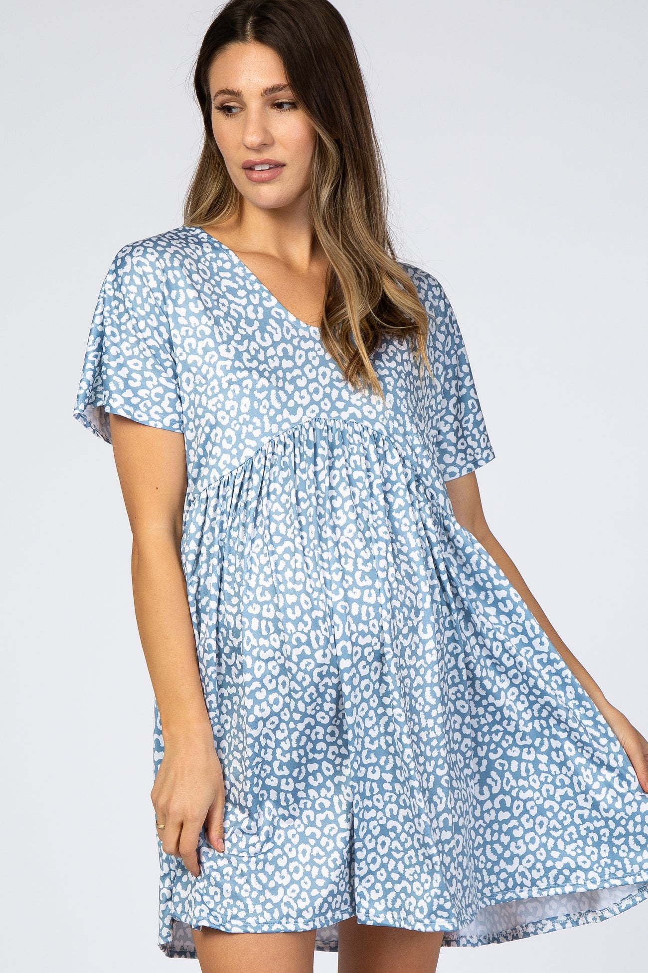 An animal print short sleeve maternity dress. Includes rounded v-neckline and empire waistline.