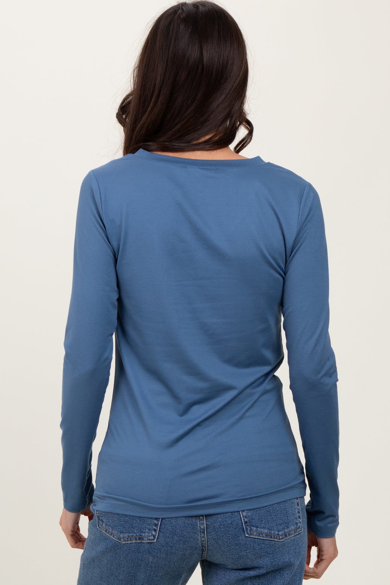 Blue Brushed Knit V-Neck Long Sleeve Top