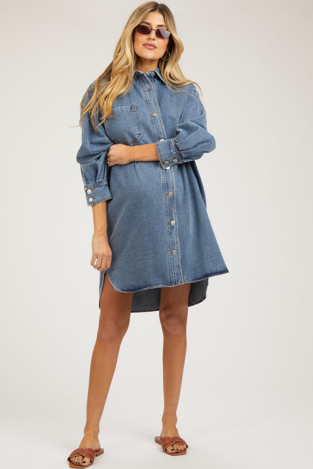 A denim maternity dress with a front pocket, a collar, long drop shoulder sleeves, functioning front buttons, side pockets, and a curved hi-lo hem with side slits.