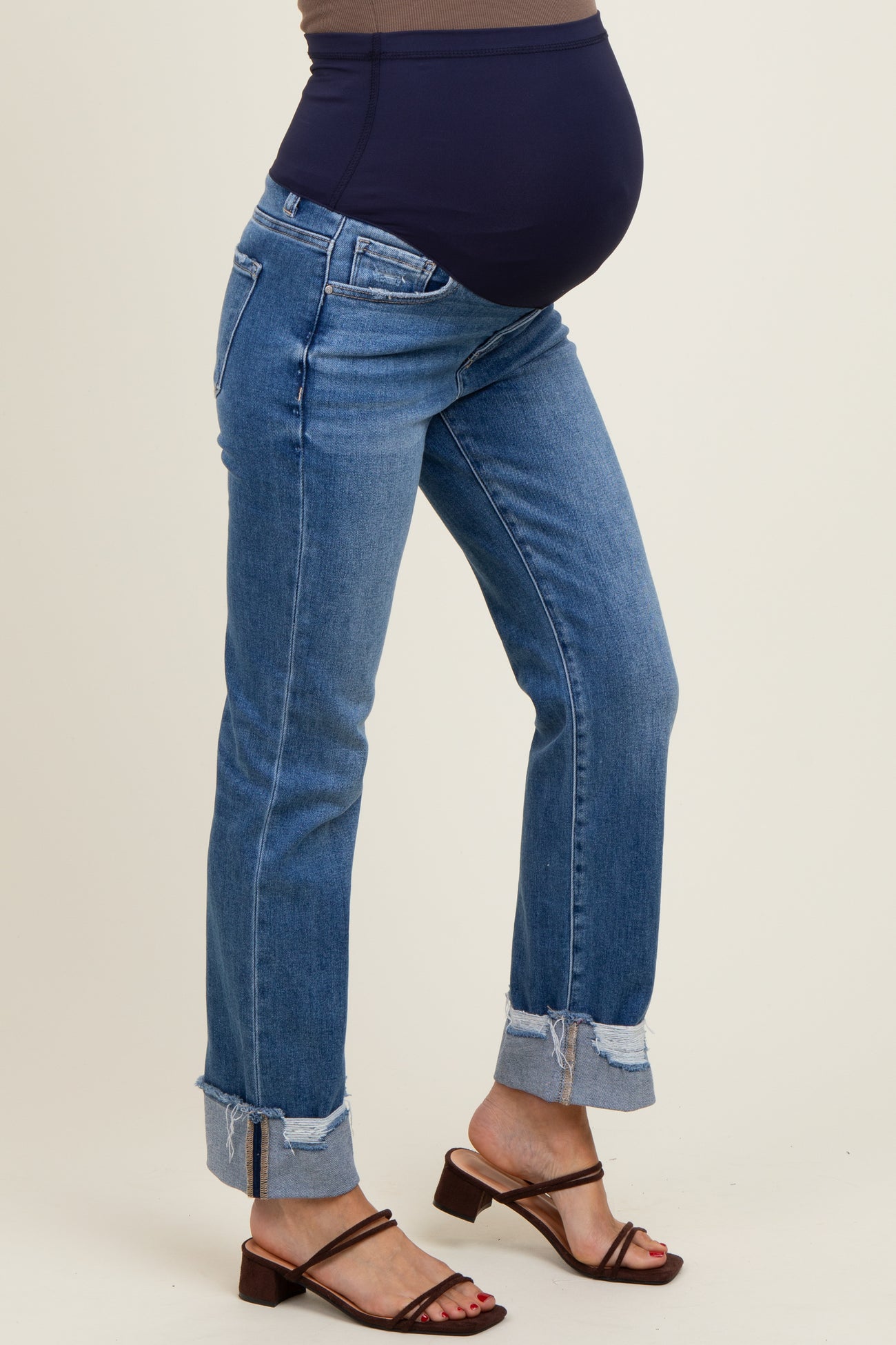 Blue Distressed Cuff Straight Leg Maternity Jeans