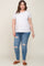 A pair of maternity plus size jeans featuring distressed detailing, 5 pockets and an elastic belly band.