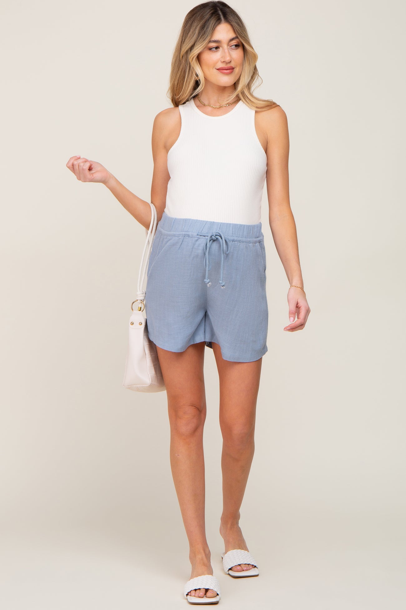 A pair of maternity shorts featuring an elastic drawstring waist and side pockets.