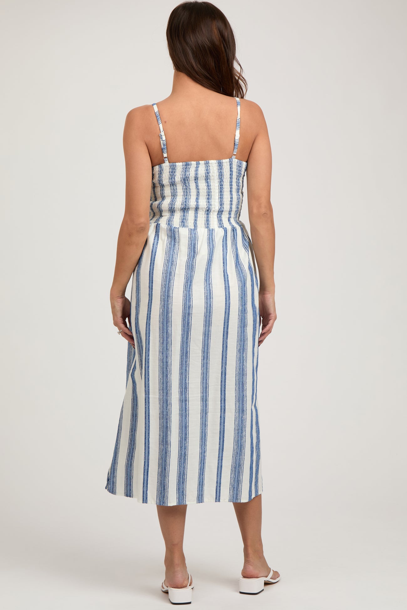 Blue Embroidered Striped Front Cutout Side Slit Maternity Midi Dress