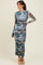 Blue Floral Mesh Overlay Ruched Midi Dress