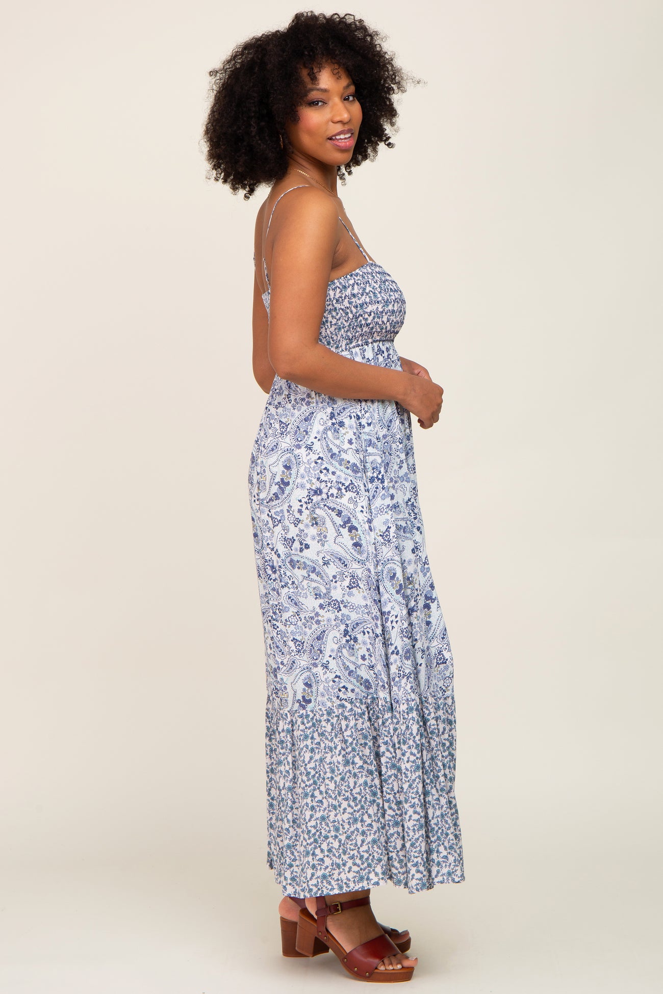 Blue Floral Paisley Smocked Button Front Maxi Dress