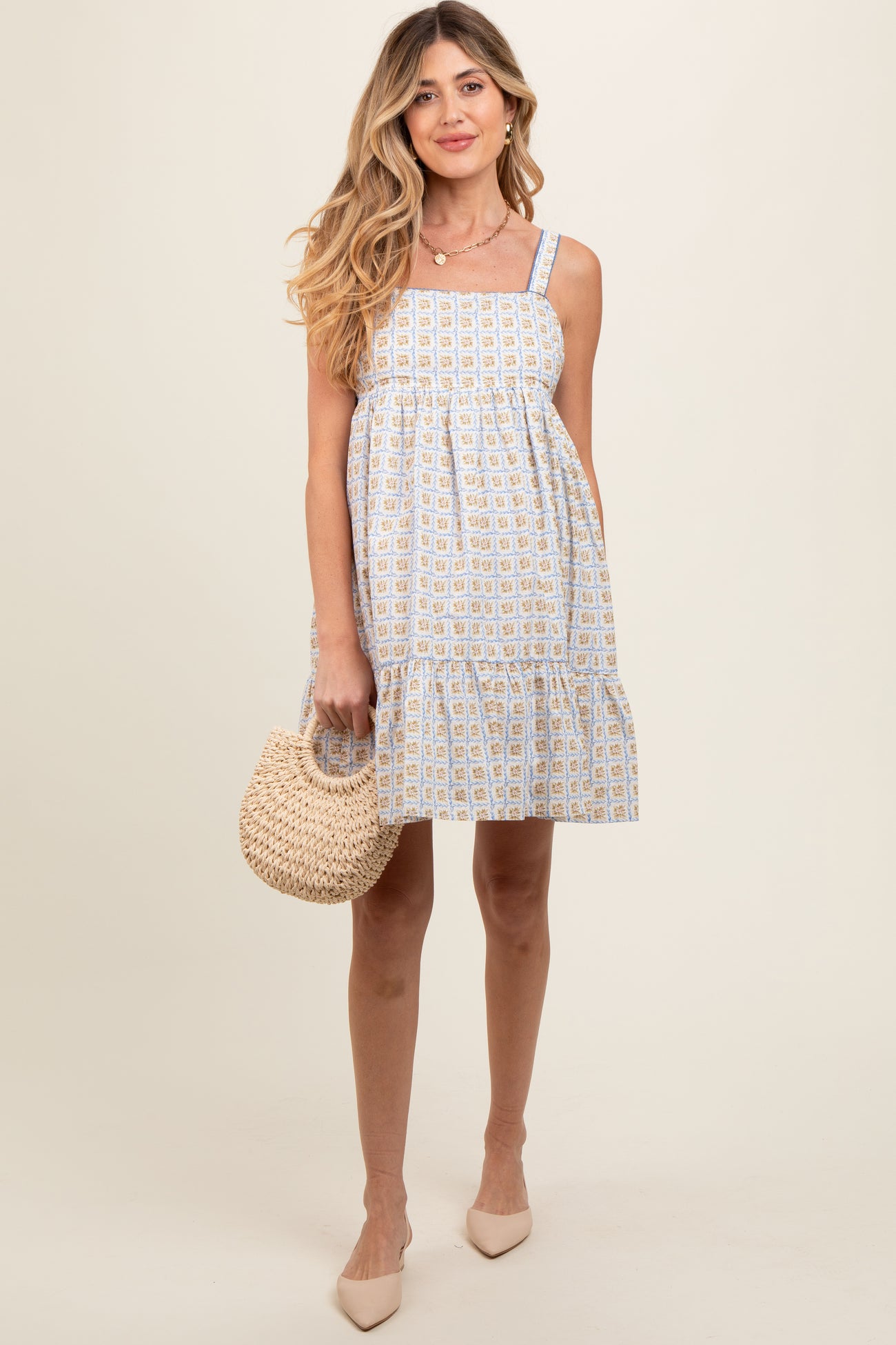 Blue Floral Print Sleeveless Ruffle Hem Maternity Mini Dress
