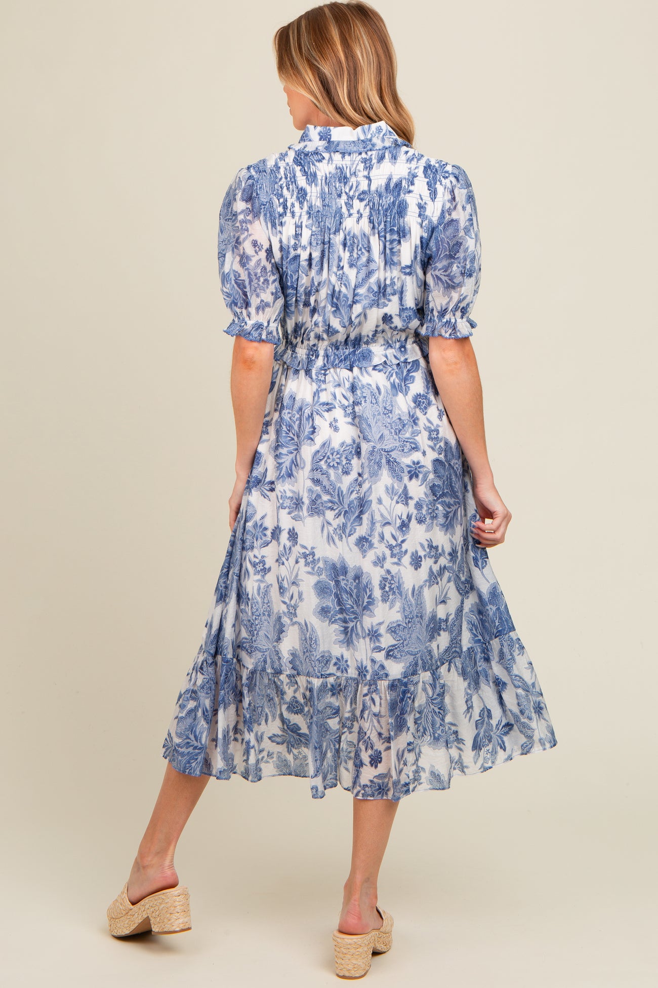 Blue Floral Ruffle Accent Button Up Maternity Midi Dress