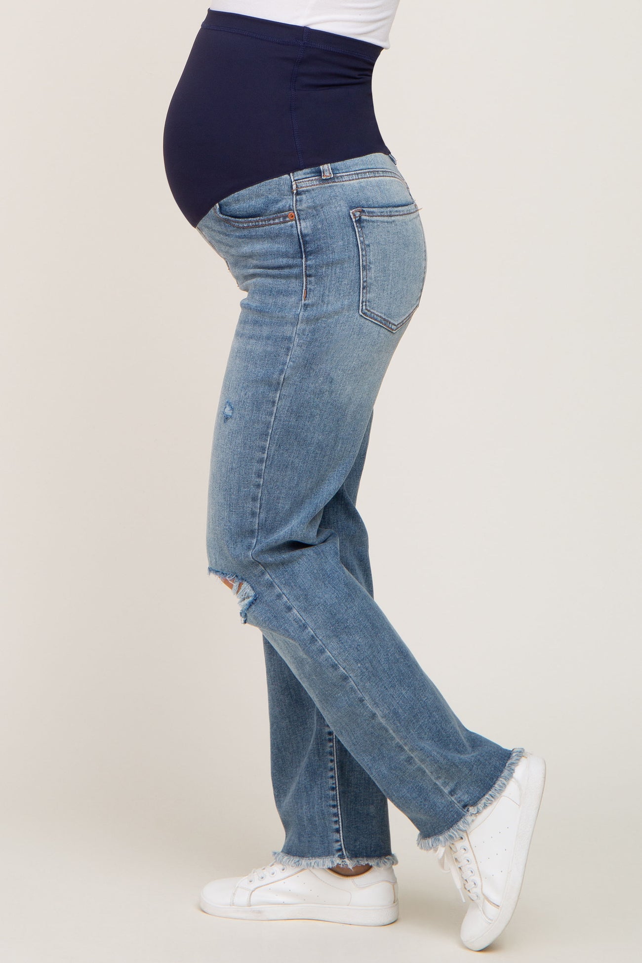 A pair of medium wash maternity straight leg jeans with distressed open knee detail, fringe hem, five pockets and full panel elastic belly band. Material has medium stretch.