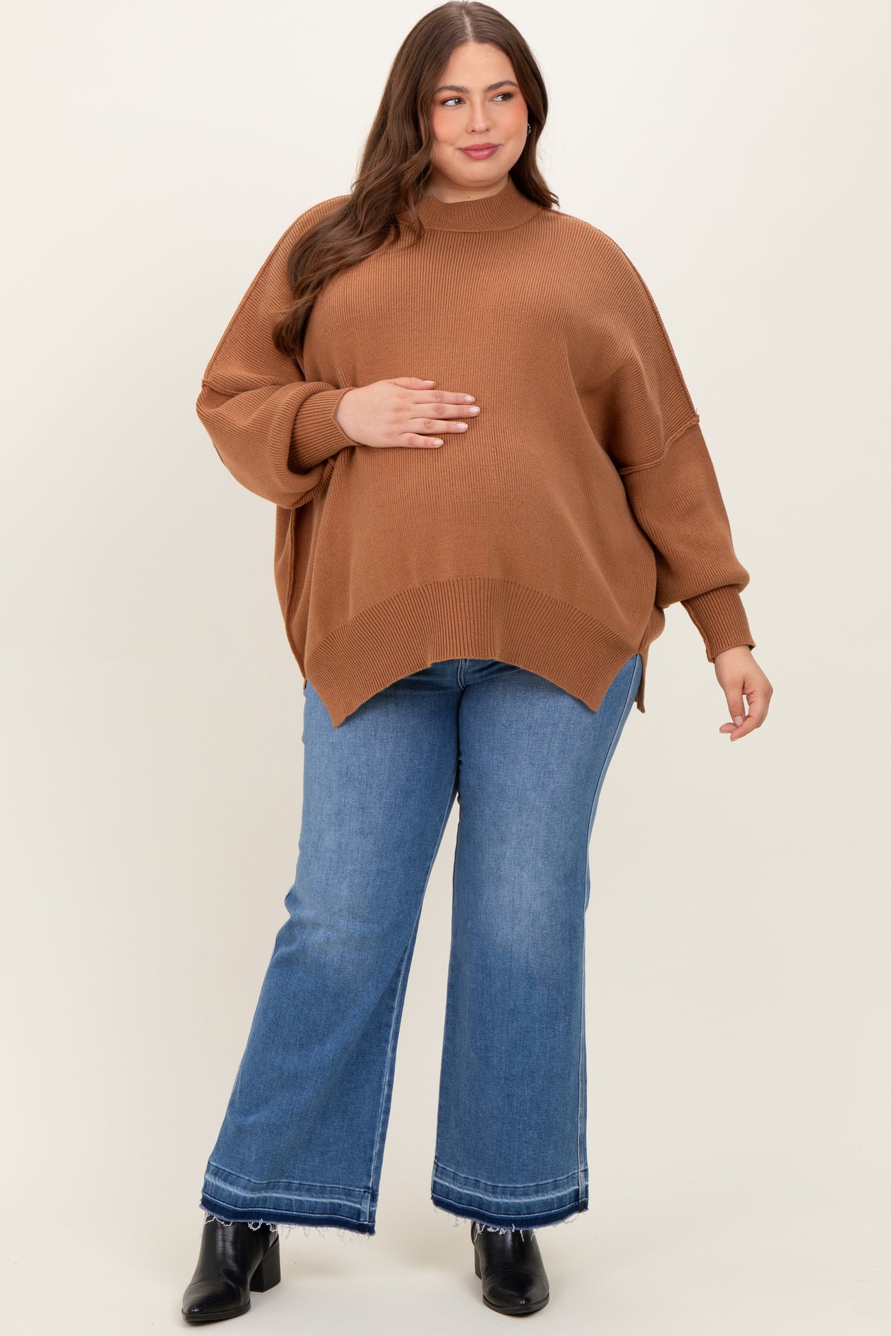 Step up your maternity style with these Raw Hem Distressed Ankle Wide Leg Maternity Plus Jeans. Designed for comfort and trendiness, these jeans feature a stretchy waistband that sits comfortably over or under your bump for a perfect fit. The raw hem and distressed detailing add an edgy, modern look, while the wide leg cut offers freedom of movement and breezy style. Pair these jeans with your favorite tees, tanks, or sweaters for a laid-back yet stylish outfit that grows with you. Perfect for everyday wear, these jeans blend comfort, versatility, and on-trend fashion during your pregnancy journey.