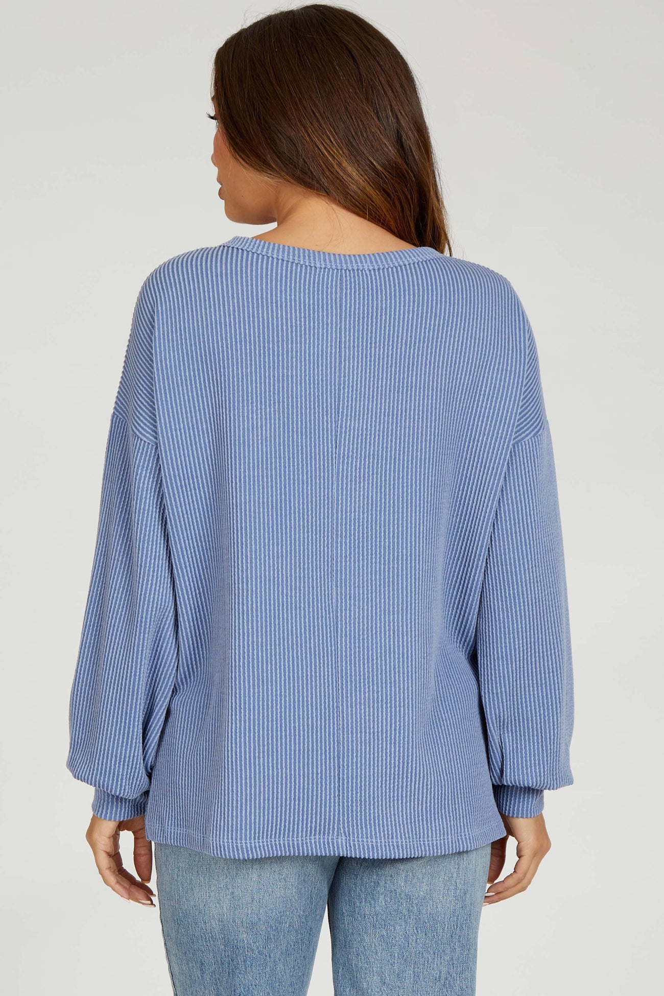 A ribbed maternity top with long sleeves, a rounded neckline, long drop shoulder sleeves, and side slits at the hem.