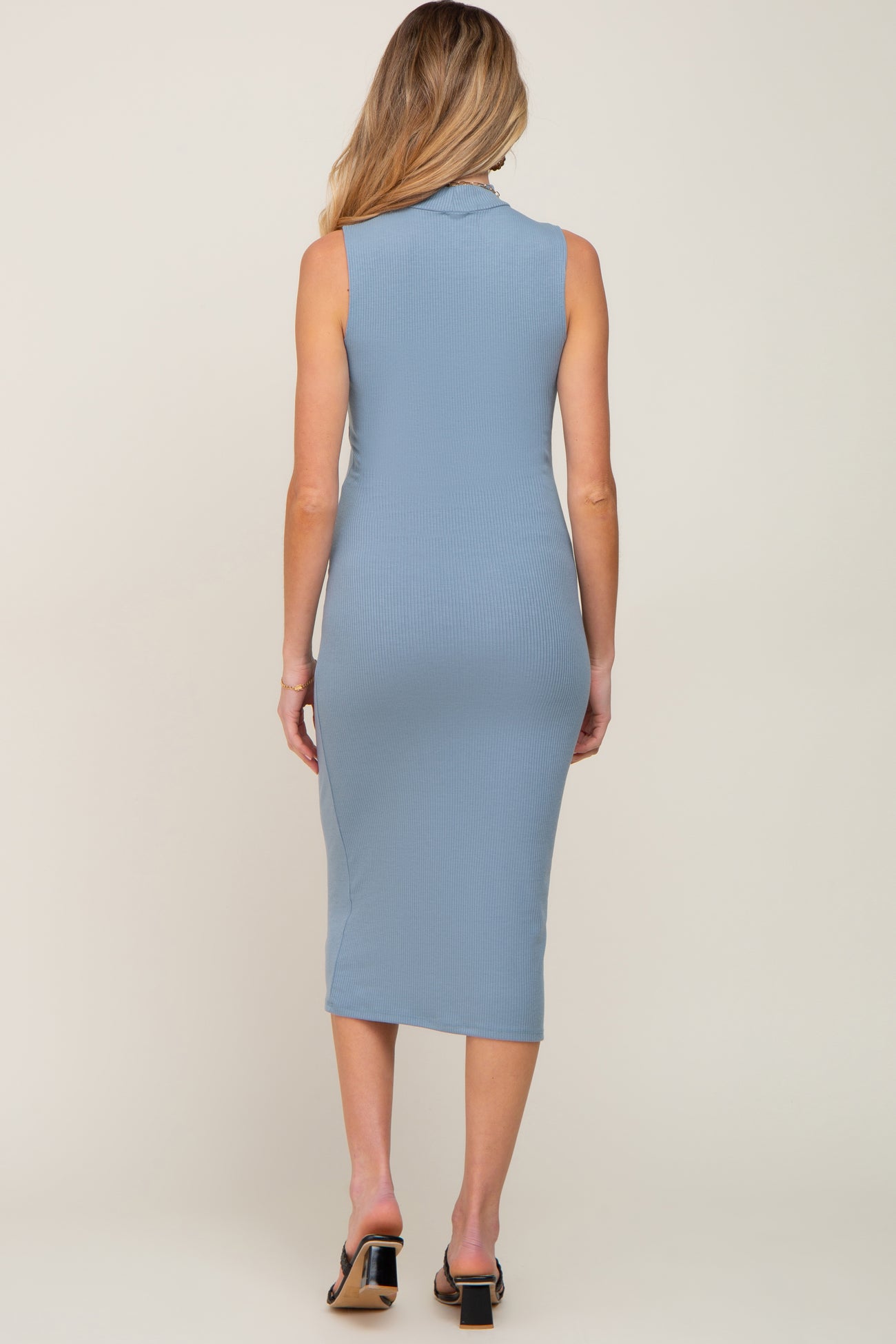 Blue Ribbed Sleeveless Mock Neck Maternity Midi Dress