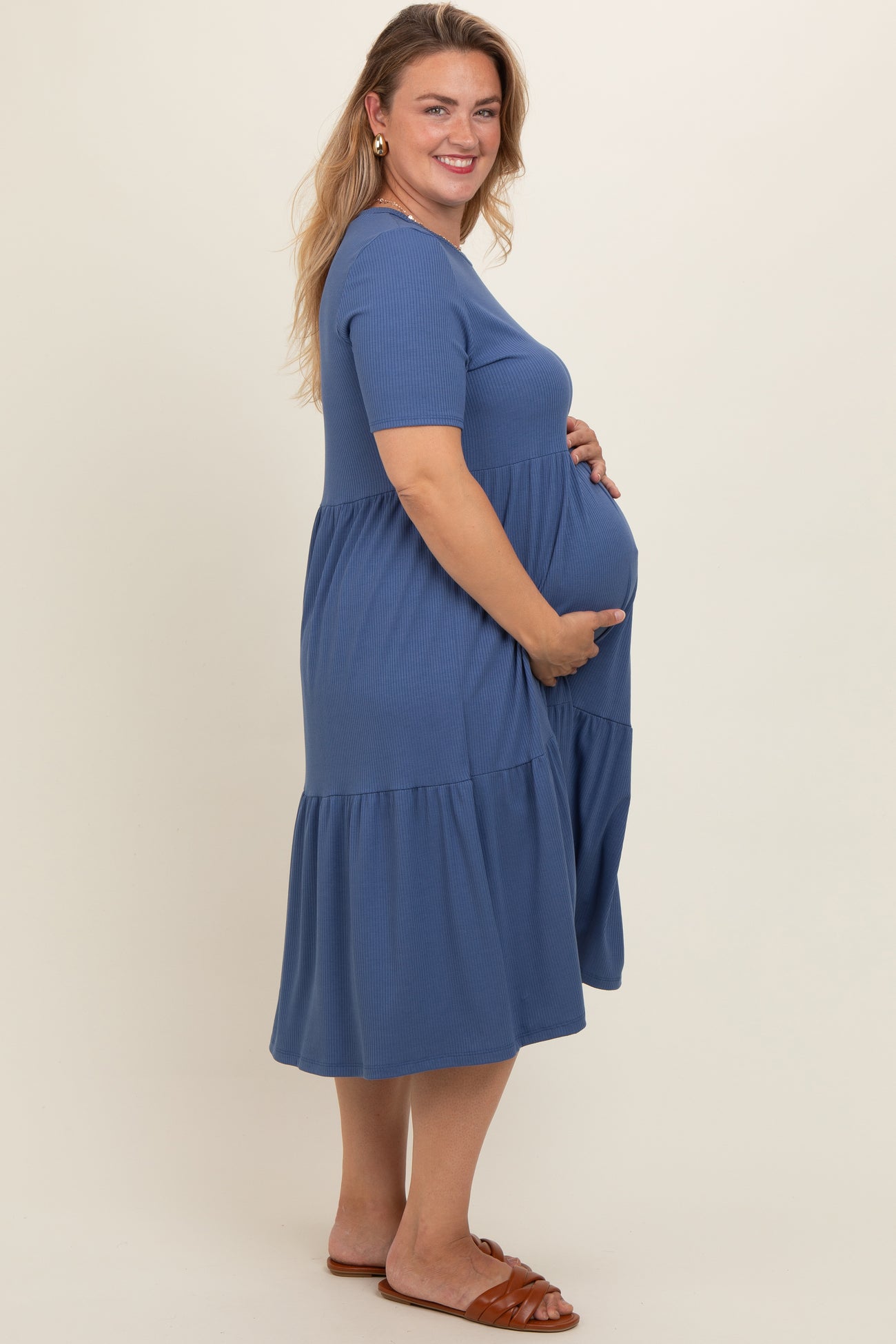 Blue Ribbed Tiered Maternity Plus Dress