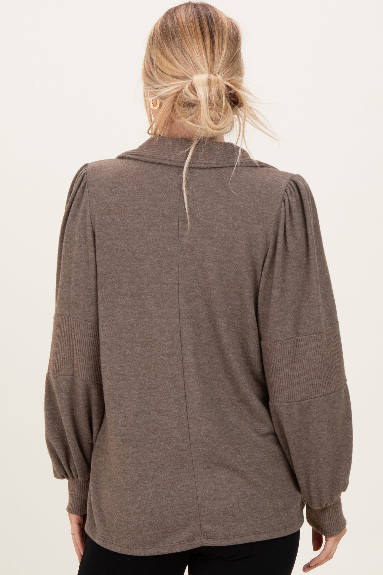 Brown Brushed Colorblock Long Sleeve Collared V-Neck Top