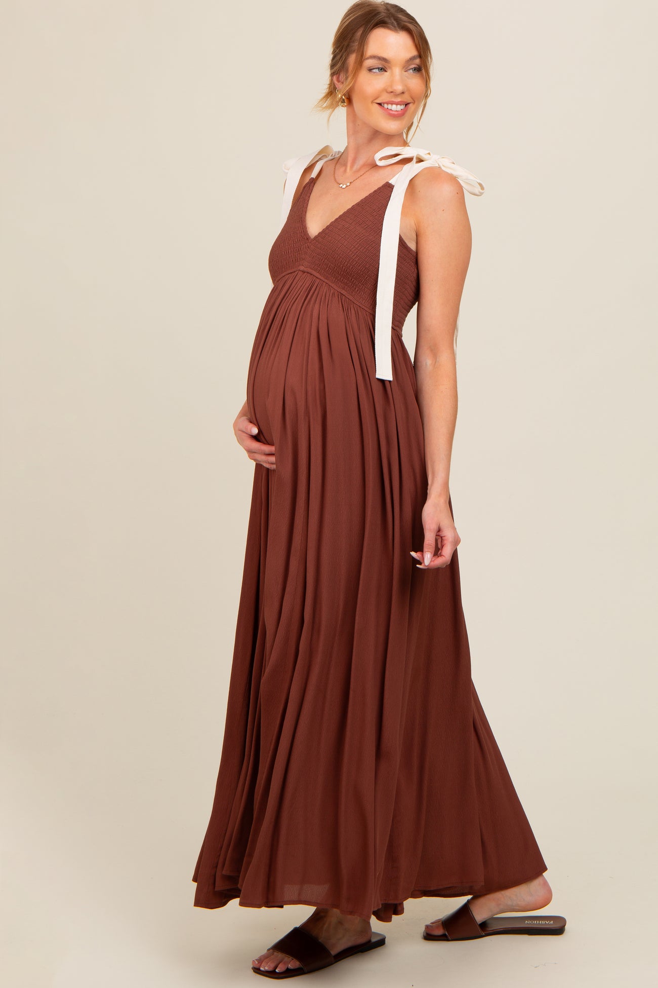 Brown Contrast Shoulder Tie Smocked Maternity Maxi Dress