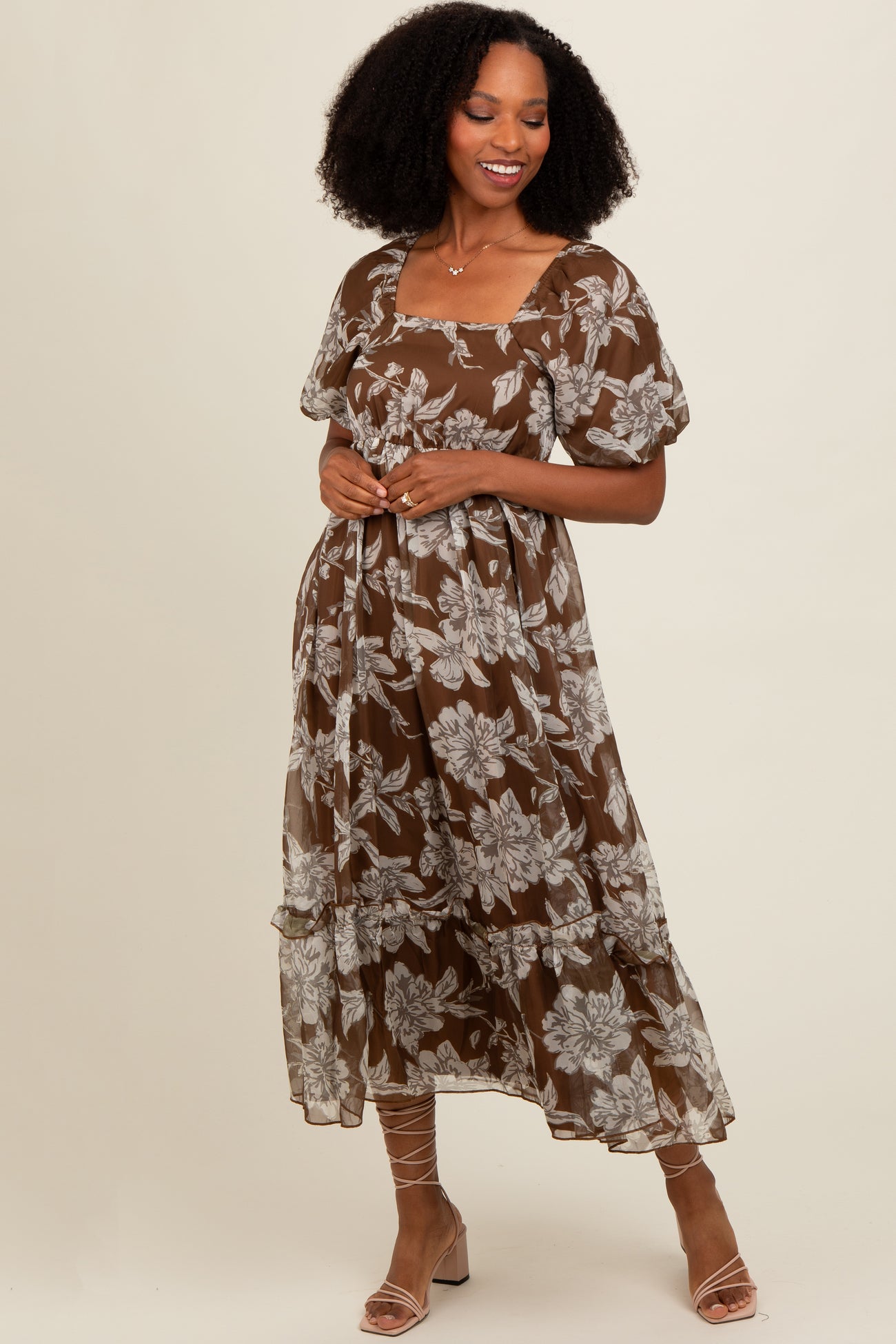 Brown Floral Chiffon Ruffle Hem Maternity Midi Dress