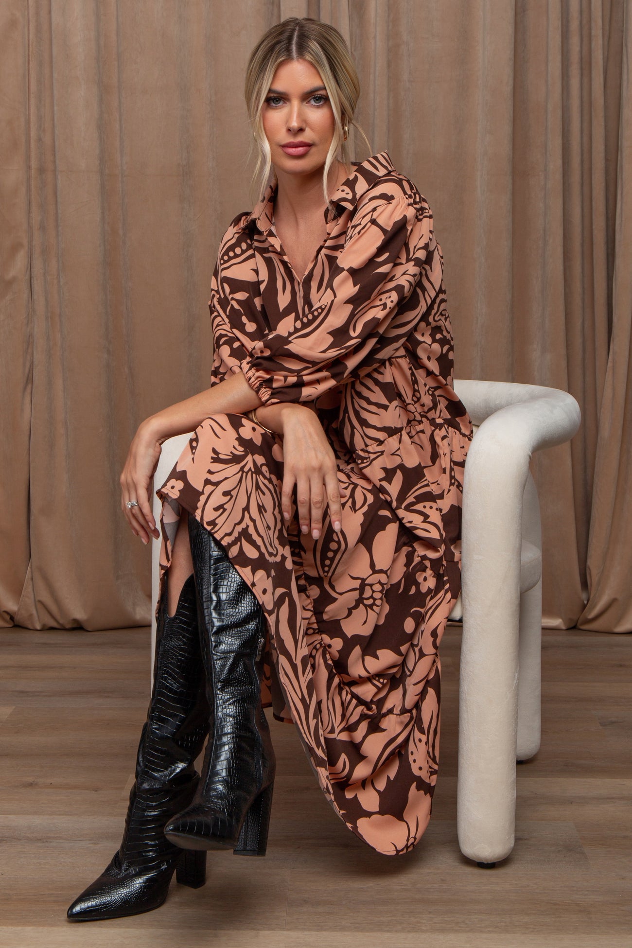 A floral paisley midi dress featuring a collared neckline, 3/4 length puff sleeves and a tiered skirt.