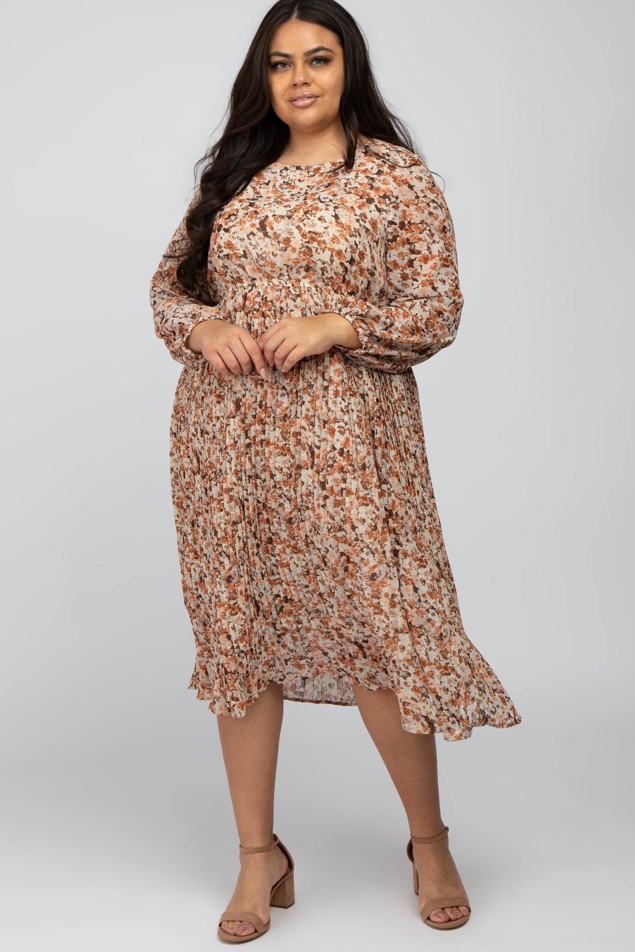 Brown Floral Pleated Skirt Plus Maternity Midi Dress