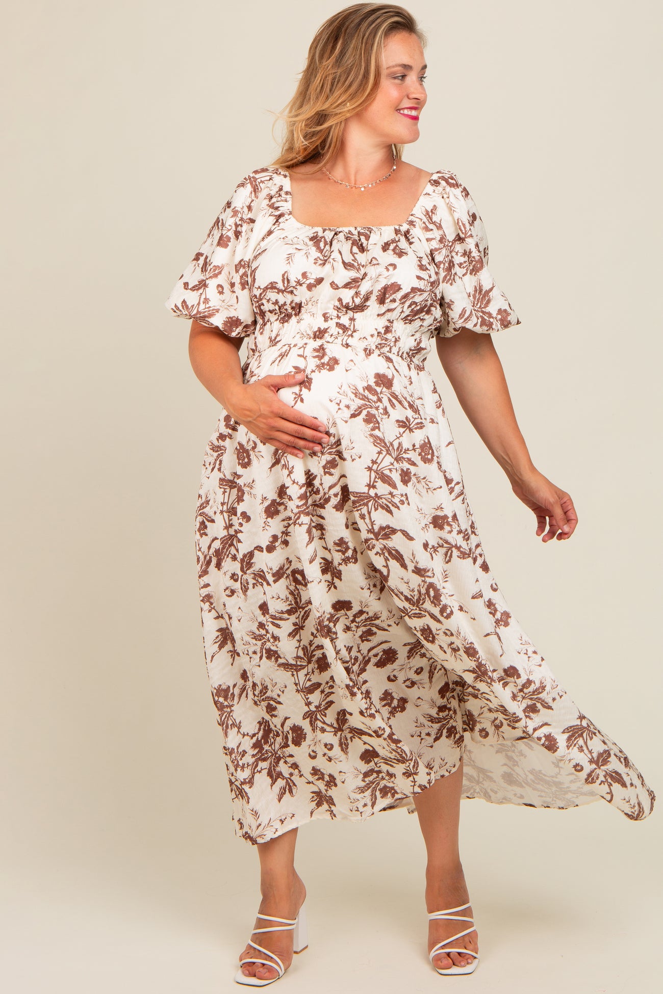 Brown Floral Puff Sleeve Maternity Plus Midi Dress