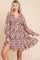 A floral print dress featuring a v-neckline, a smocked bodice, long sleeves and ruffle trim. Double lined.