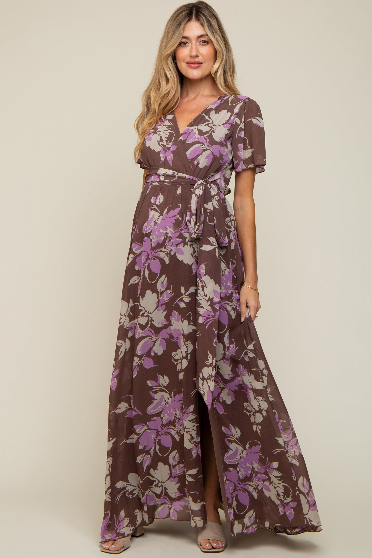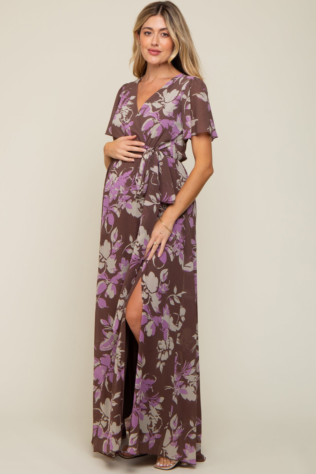 A floral print maternity maxi dress featuring a wrap v-neckline, short sleeves, a self-tie waist and side slits. Double lined.