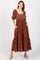 Brown Gauze Smocked Embroidered Square Neck Midi Dress