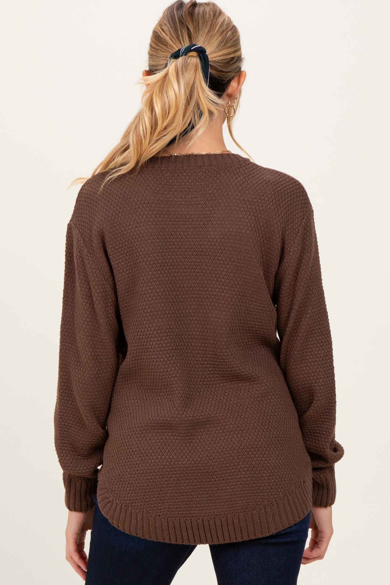 Stay cozy and stylish throughout your pregnancy with this Brown Knit Pullover Maternity Sweater. Crafted from soft, breathable fabric, it offers gentle stretch to accommodate your growing bump comfortably. The classic round neckline and textured knit pattern add a timeless touch, while the ribbed cuffs and hem provide a snug fit. Perfect for layering or wearing on its own, this sweater pairs effortlessly with jeans or leggings for casual, everyday wear. Designed specifically for maternity, it ensures a flattering fit without sacrificing comfort. Ideal for cooler days, this versatile piece is a must-have addition to your maternity wardrobe.