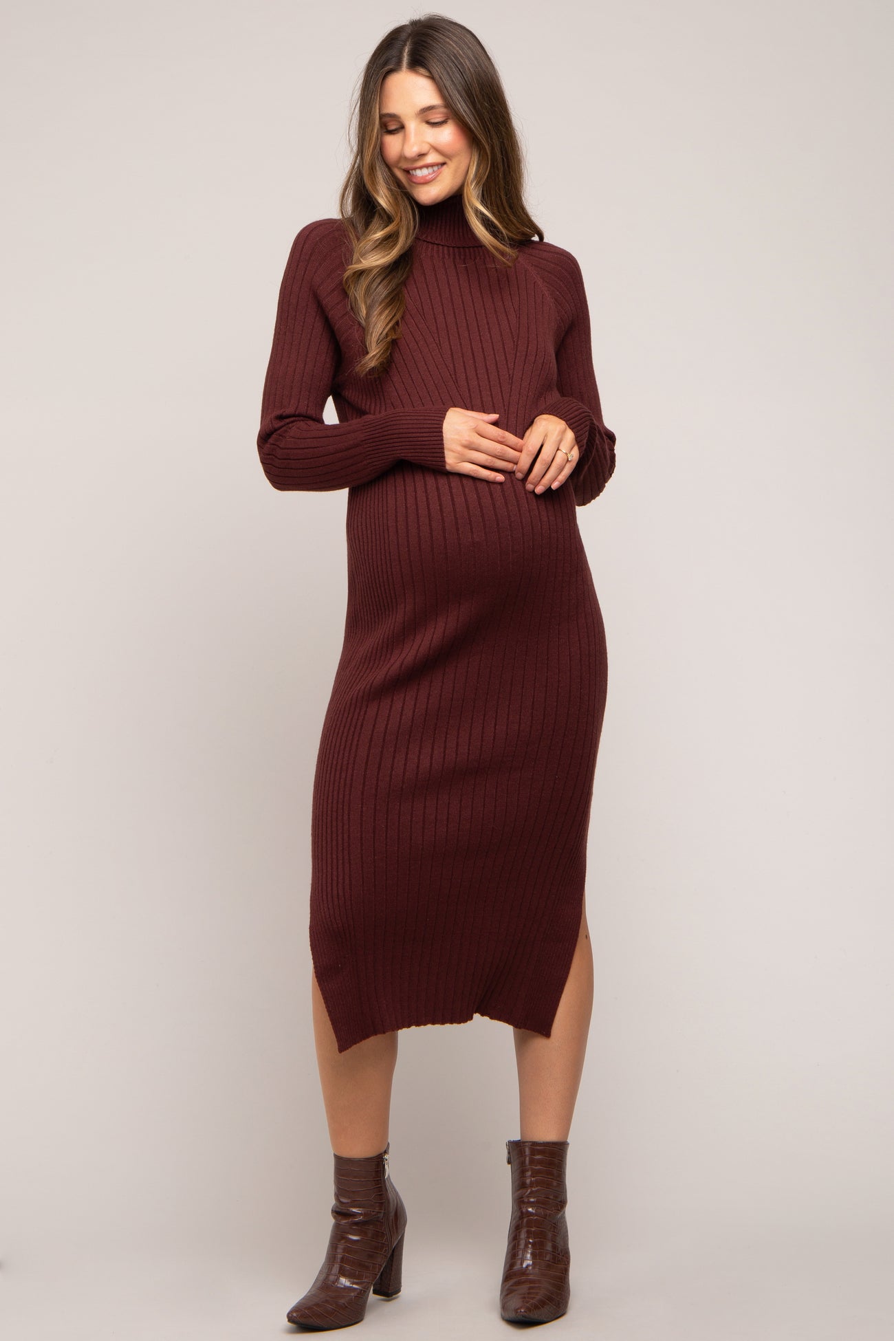Brown Long Sleeve Turtleneck Maternity Sweater Dress