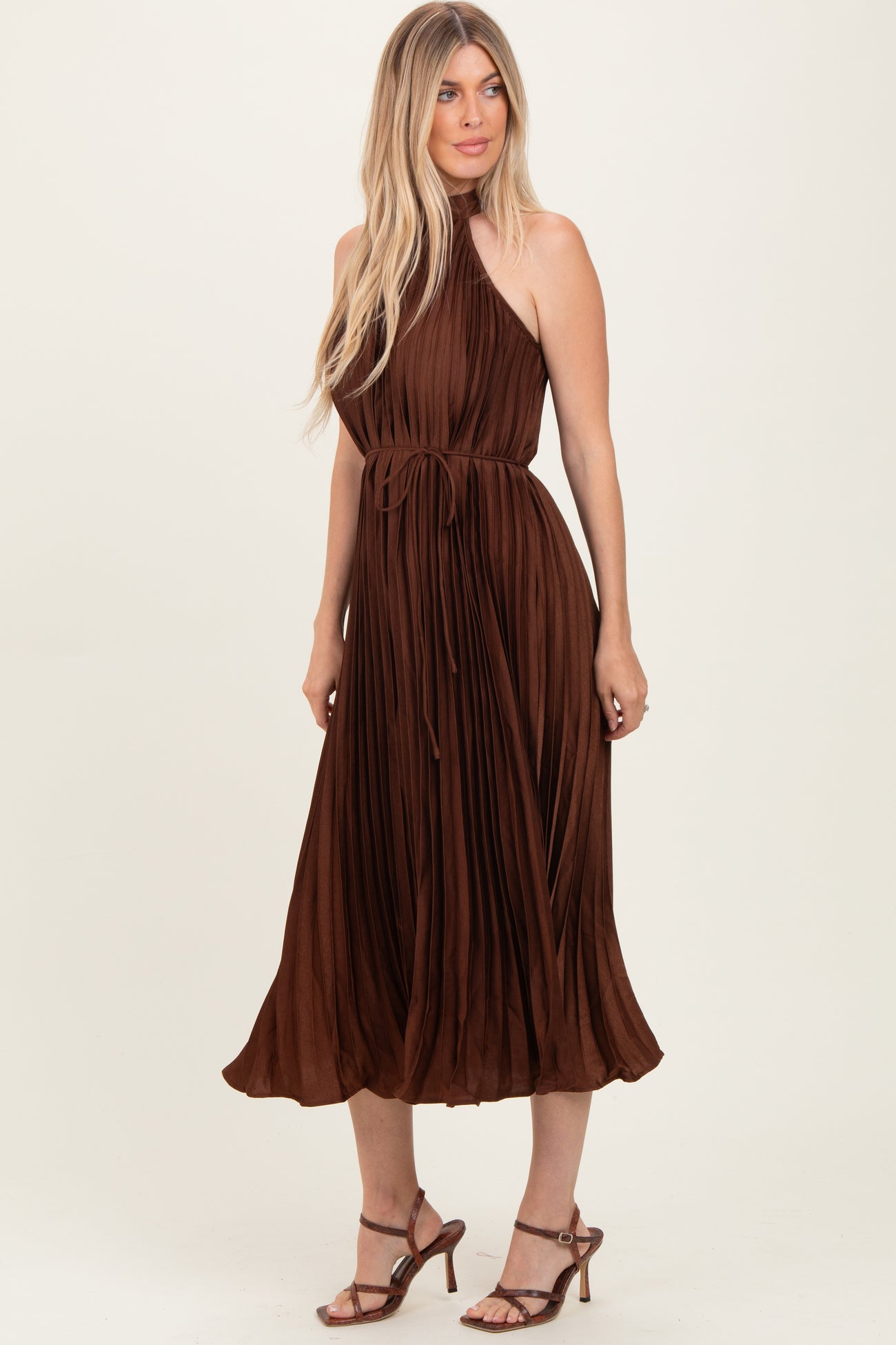 Elevate your wardrobe with this stunning Brown Pleated Halter Dress, designed for effortless elegance. Crafted from lightweight, flowy fabric, this midi dress features delicate pleats that create graceful movement with every step. The halter neckline adds a chic touch, while the drawstring waist cinches for a flattering silhouette. Perfect for garden parties, evening events, or casual outings, this versatile dress pairs beautifully with heels or sandals. Embrace timeless style and comfort in this must-have dress that combines sophistication with easygoing charm. Available in multiple sizes for the perfect fit.