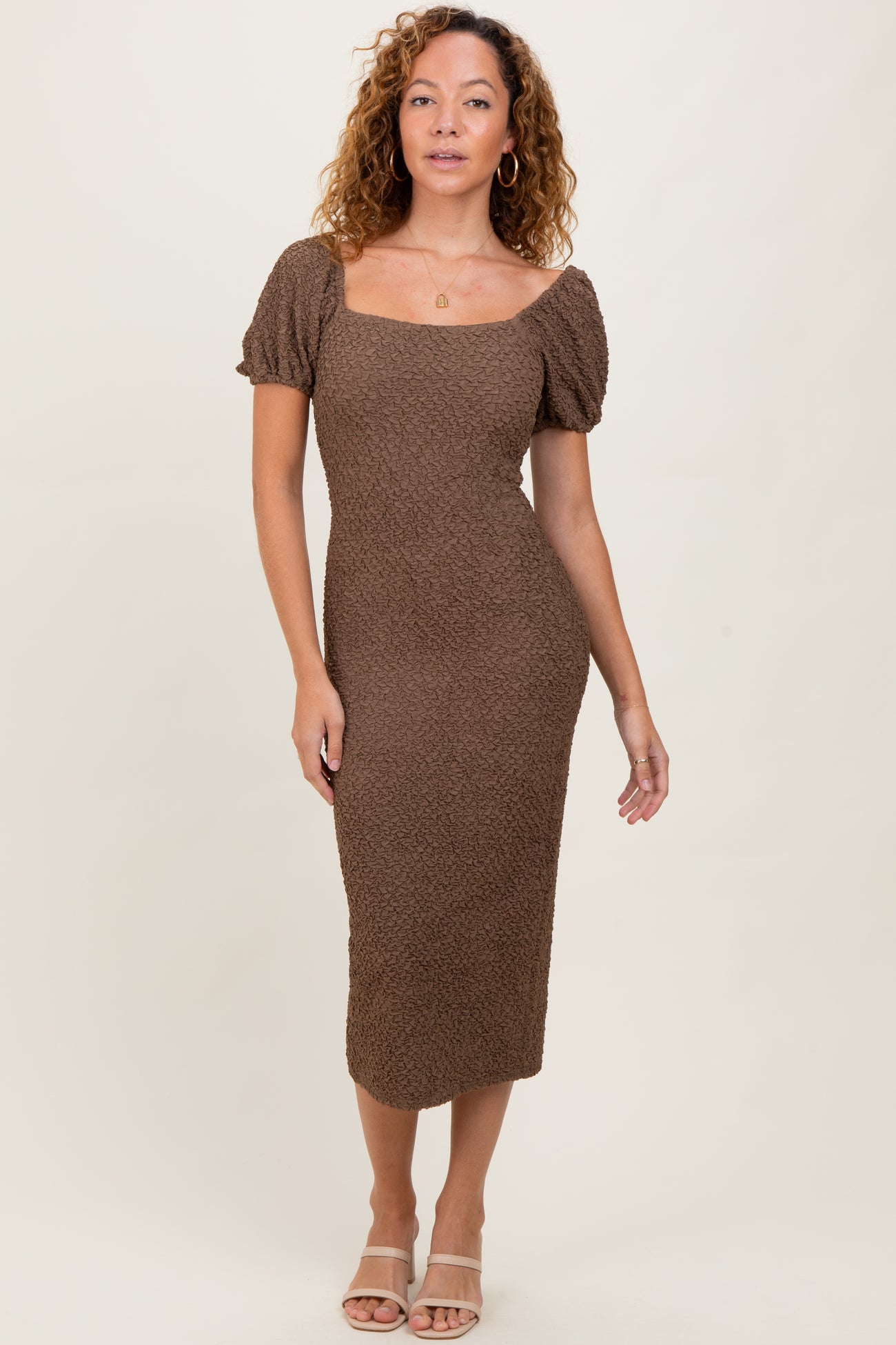Brown Popcorn Textured Short Puff Sleeve Maternity Midi Dress