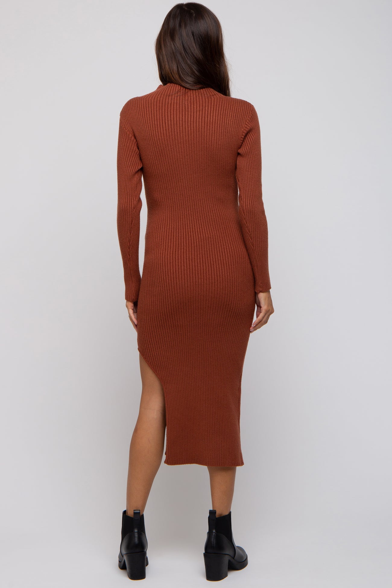 Brown Ribbed Mock Neck Side Slit Maternity Midi Dress
