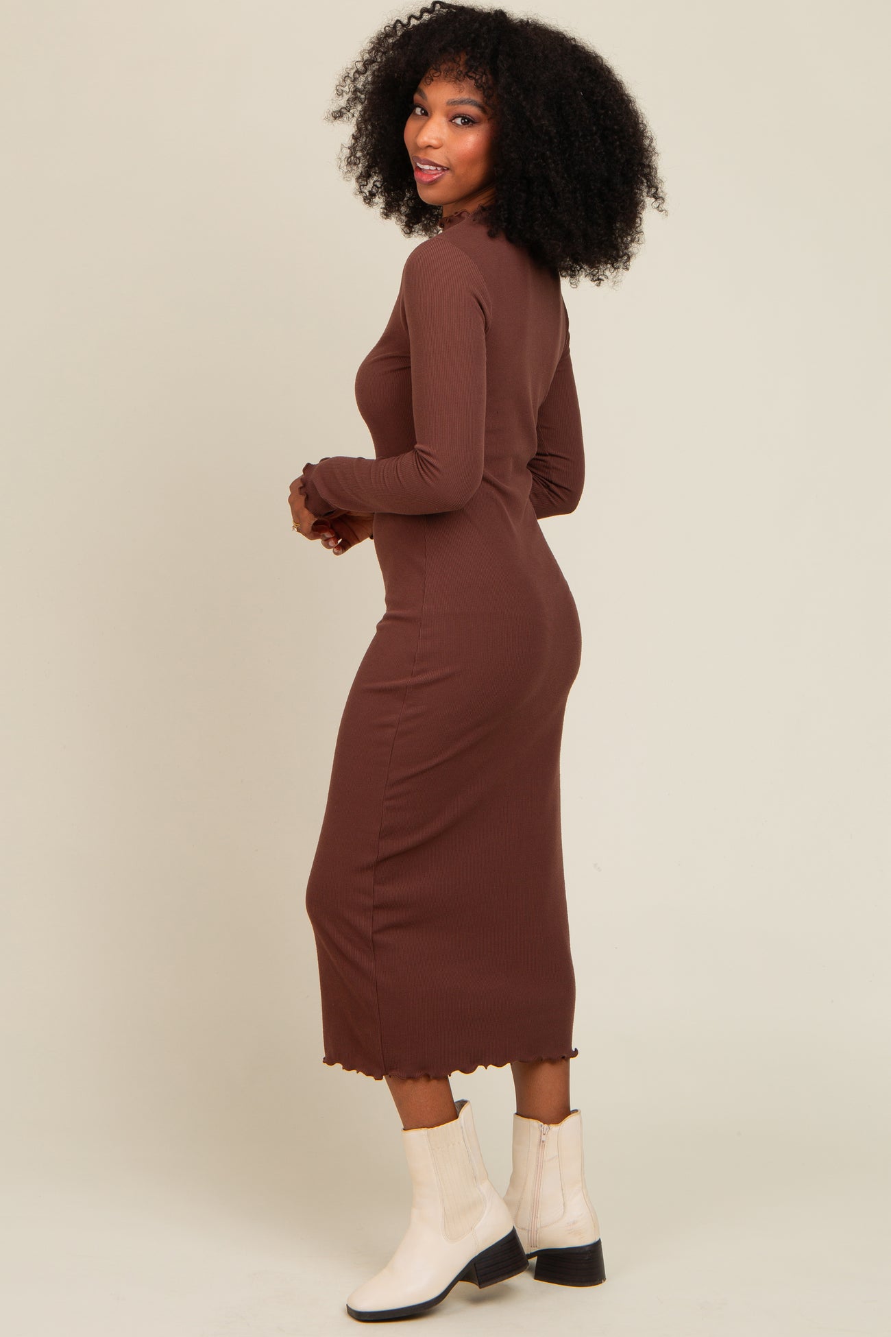 Brown Ruffle Mock Neck Long Sleeve Midi Dress