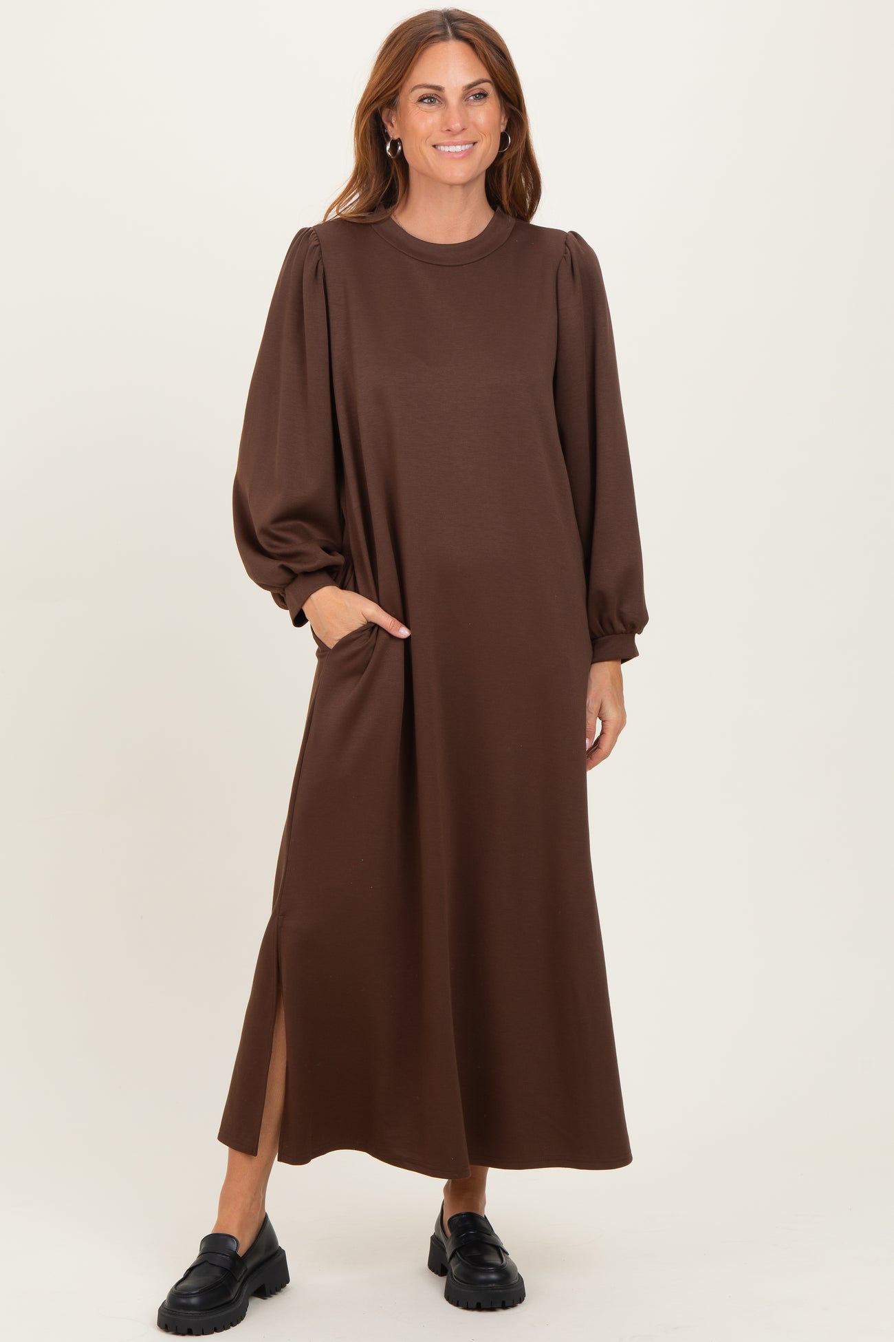 Embrace comfort and style with our Brown Side Slit Detail Solid Maternity Midi Dress. Crafted from soft, breathable fabric, this dress offers gentle stretch to accommodate your growing bump. Featuring elegant puffed long sleeves and a modest round neckline, it balances a refined look with everyday ease. Side slit detail adds a touch of flair and effortless movement, while convenient side pockets provide practicality without sacrificing style. The rich brown hue is perfect for versatile wear, whether you're dressing up for a special occasion or enjoying a casual day out. A must-have staple for your maternity wardrobe, combining comfort, function, and chic design effortlessly.