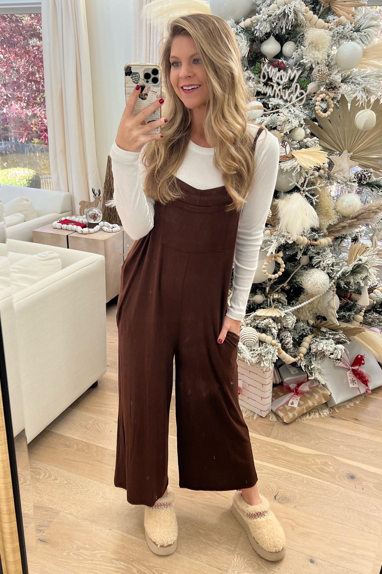 A solid sleeveless jumpsuit featuring wide legs, a front pocket and side pockets.