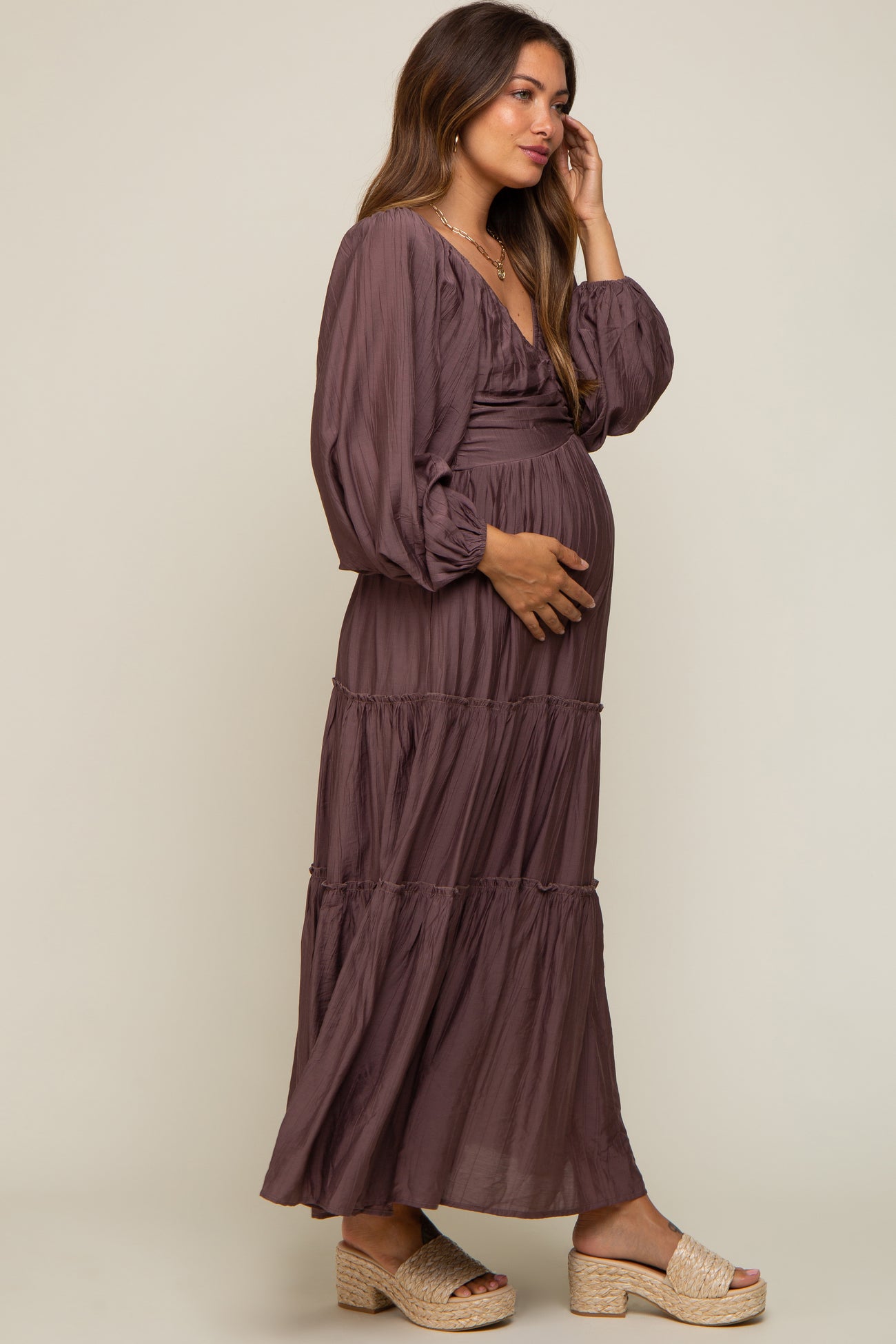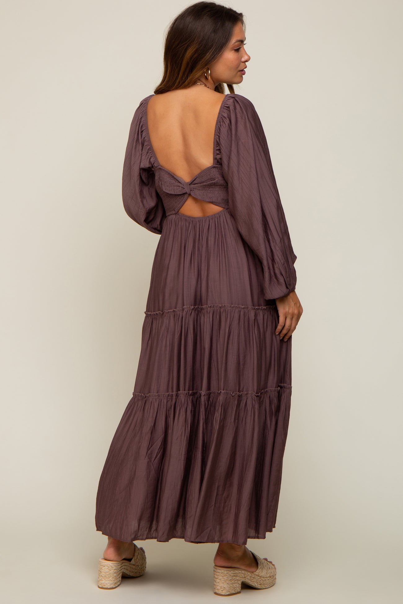 Brown Smocked Front Cutout Tiered Maternity Maxi Dress