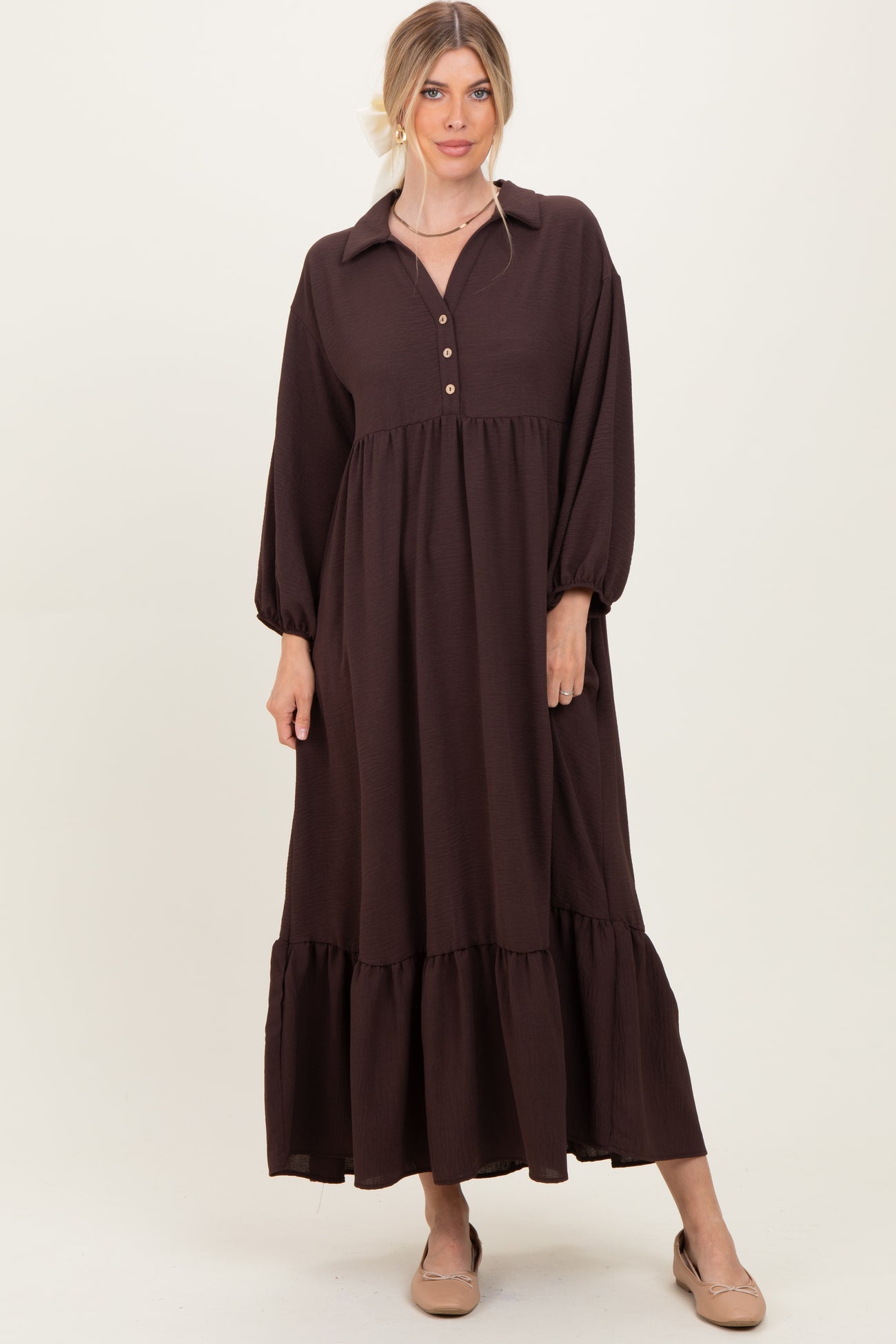 Elevate your everyday style with this Brown Solid Long Sleeve Button Down Tiered Collared Dress. Crafted from lightweight, textured fabric, this maxi dress features a relaxed fit with a chic tiered skirt that flows effortlessly. The collared neckline and button-down front add classic charm, while the long puff sleeves with elastic cuffs bring a modern, feminine touch. Perfect for any season, this versatile piece can be dressed up with heels or kept casual with flats. Embrace comfort and elegance in one timeless dress that’s ideal for work, brunch, or weekend outings. Available in multiple sizes.