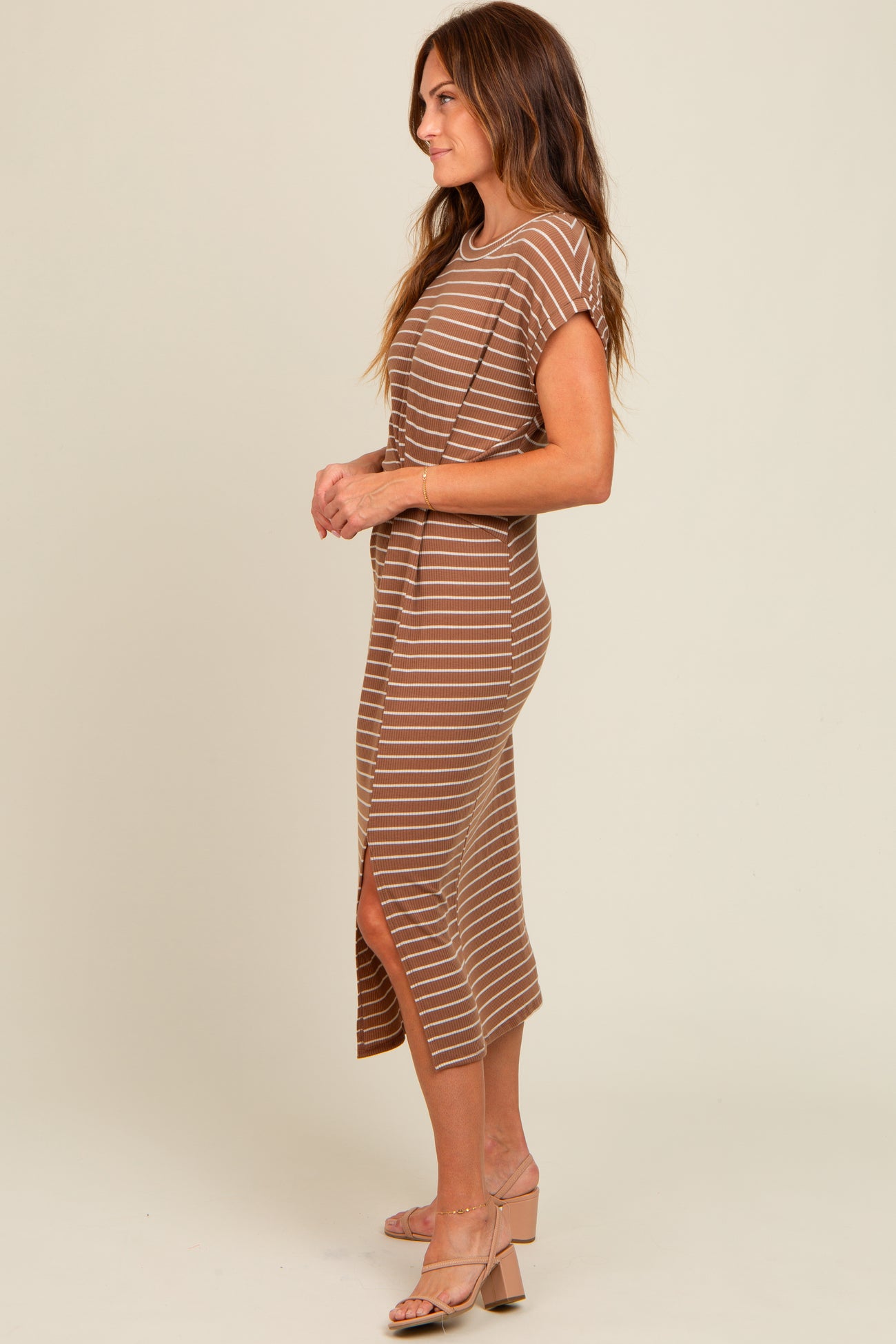 Brown Striped Gathered Waist Dress