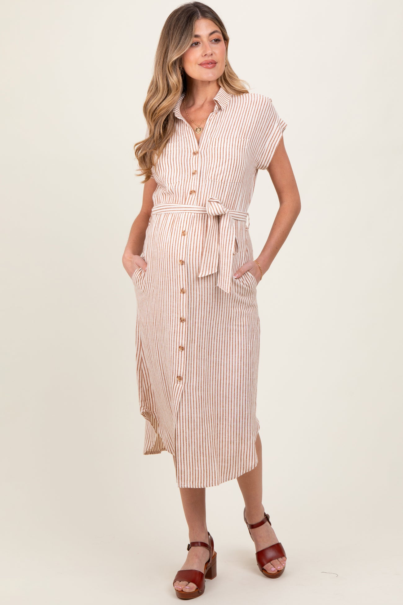 Brown Striped Sash Tie Maternity Midi Shirt Dress