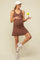 A soft knit maternity tennis romper dress. Features a scoop neckline, a racerback with a cutout, removable cups, an elastic band under the bust, and side pockets on the shorts.