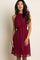 A solid, sleeveless, chiffon dress featuring a high neckline with ruffle trim collar, a tie in the back, and double lining to prevent sheerness.