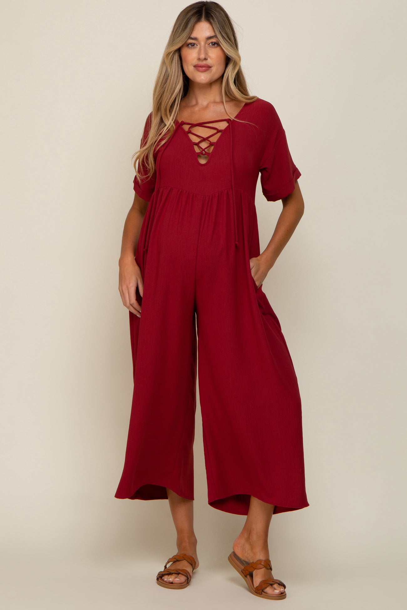 Burgundy Crisscross Wide Leg Maternity Jumpsuit
