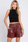 A pair of stretchy faux leather shorts featuring a pleated waist with an elastic waistband and side pockets.