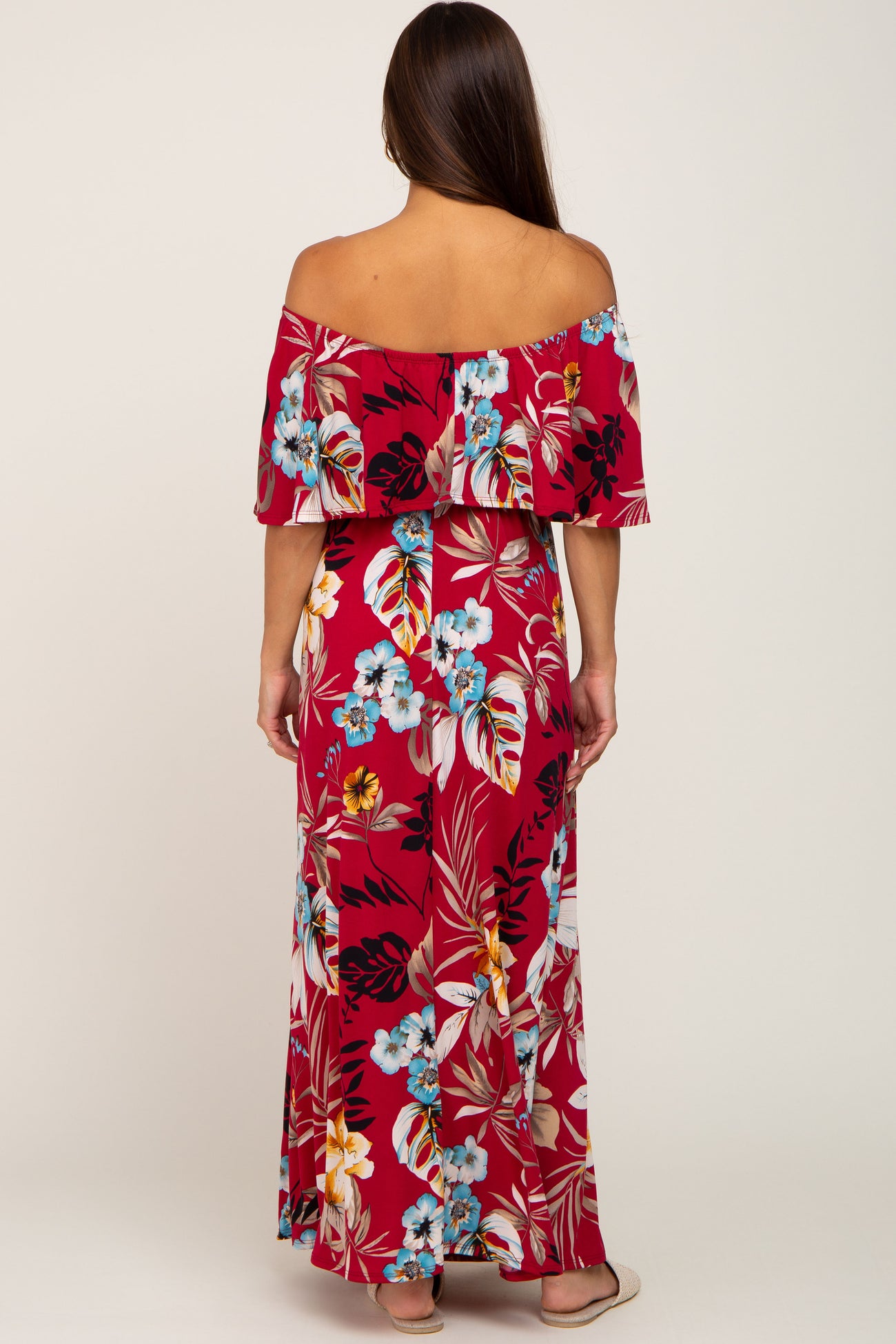 Burgundy Floral Flounce Off Shoulder Maternity Maxi Dress